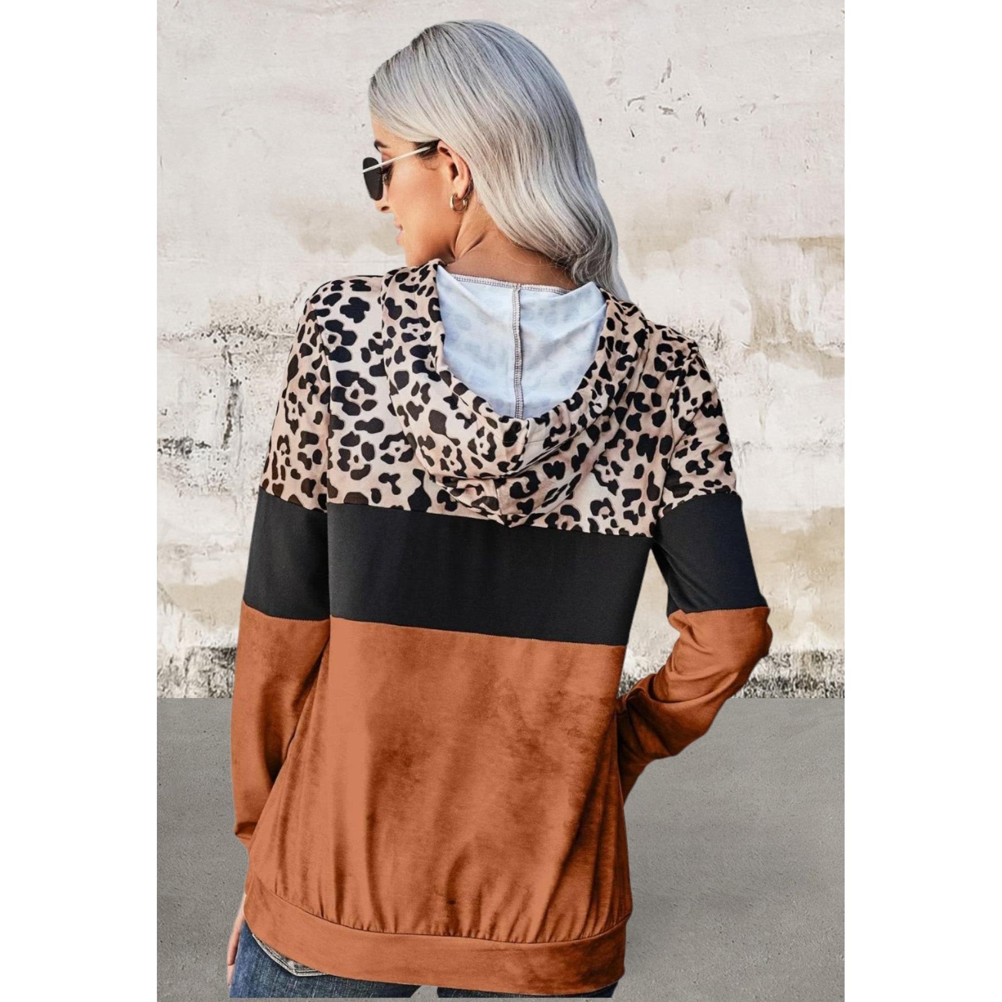 Our Long Sleeve Leopard Colorblock Hoodie is the perfect choice for your casual wardrobe. A stylish combination of leopard print and modern colorblocking, this high-quality hoodie ensures warmth and comfort. Layer over a tee and denim for a classic weekend look.