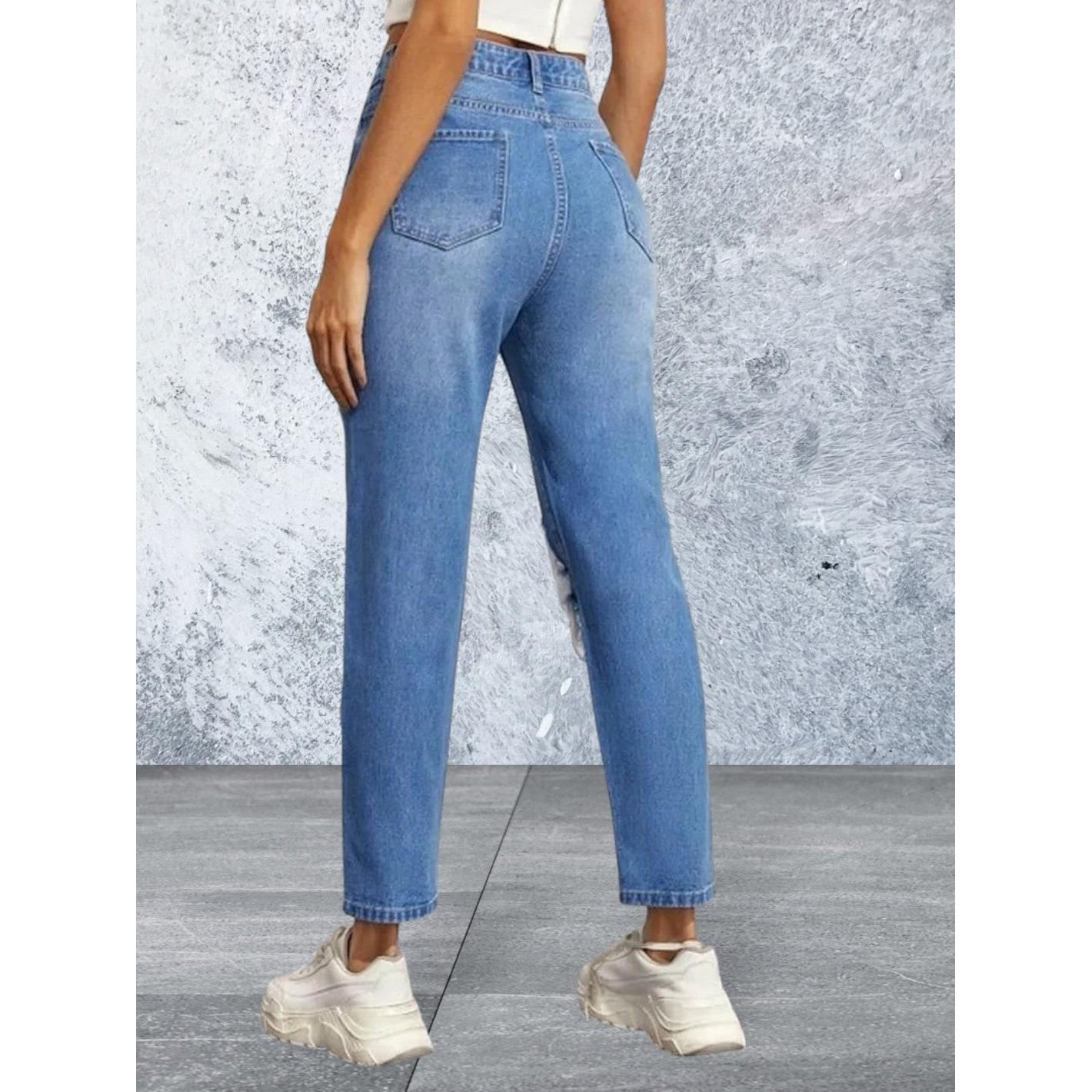 High waisted light blue ripped straight leg jeans