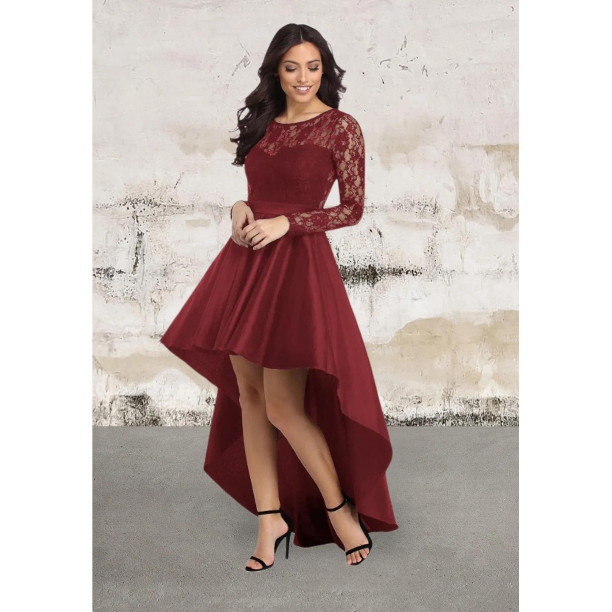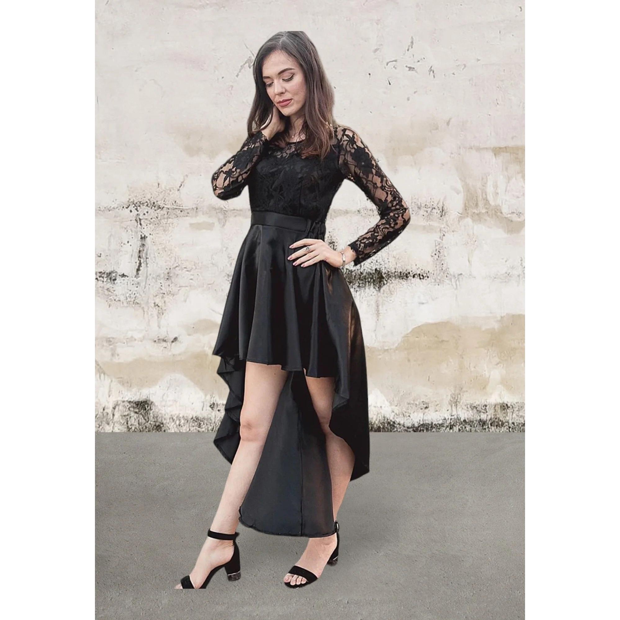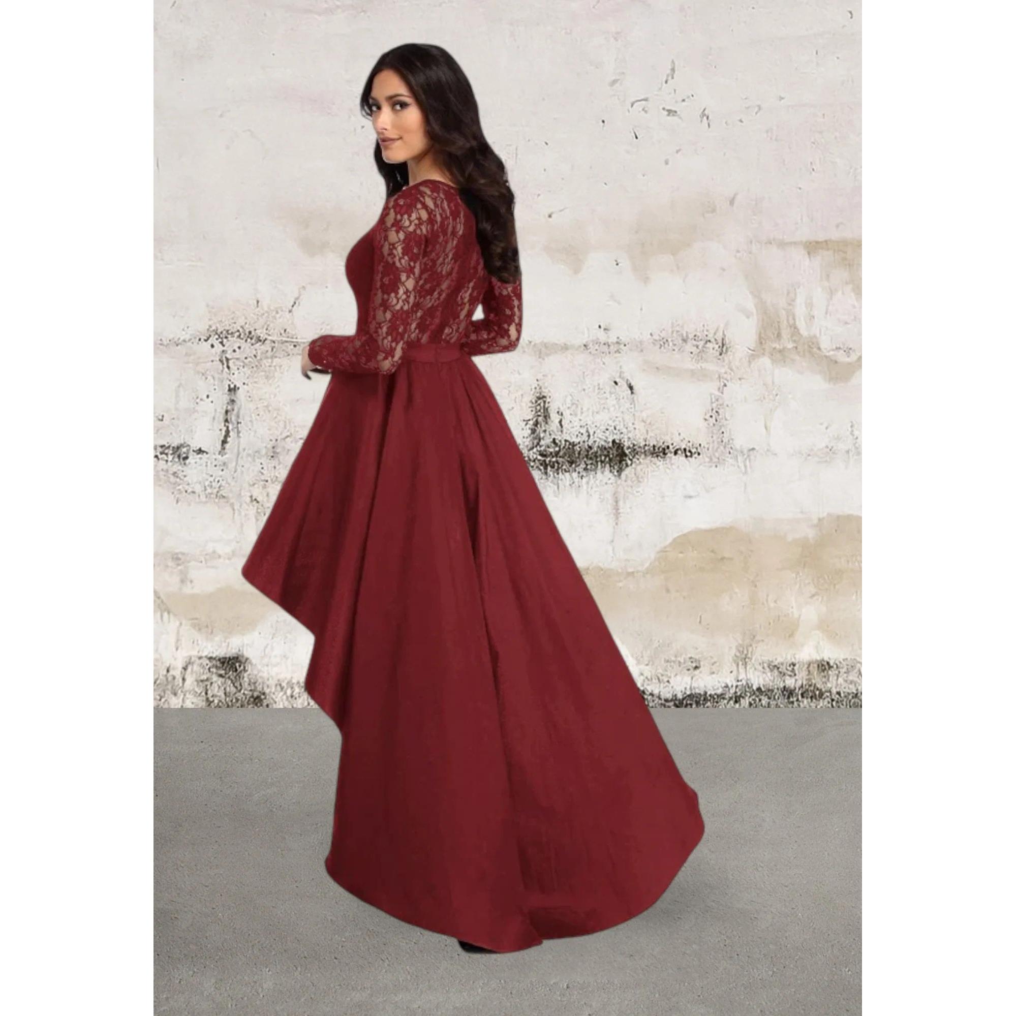 Lace bodice, sheer long sleeves, a sweetheart lining and a high-low taffeta skirt