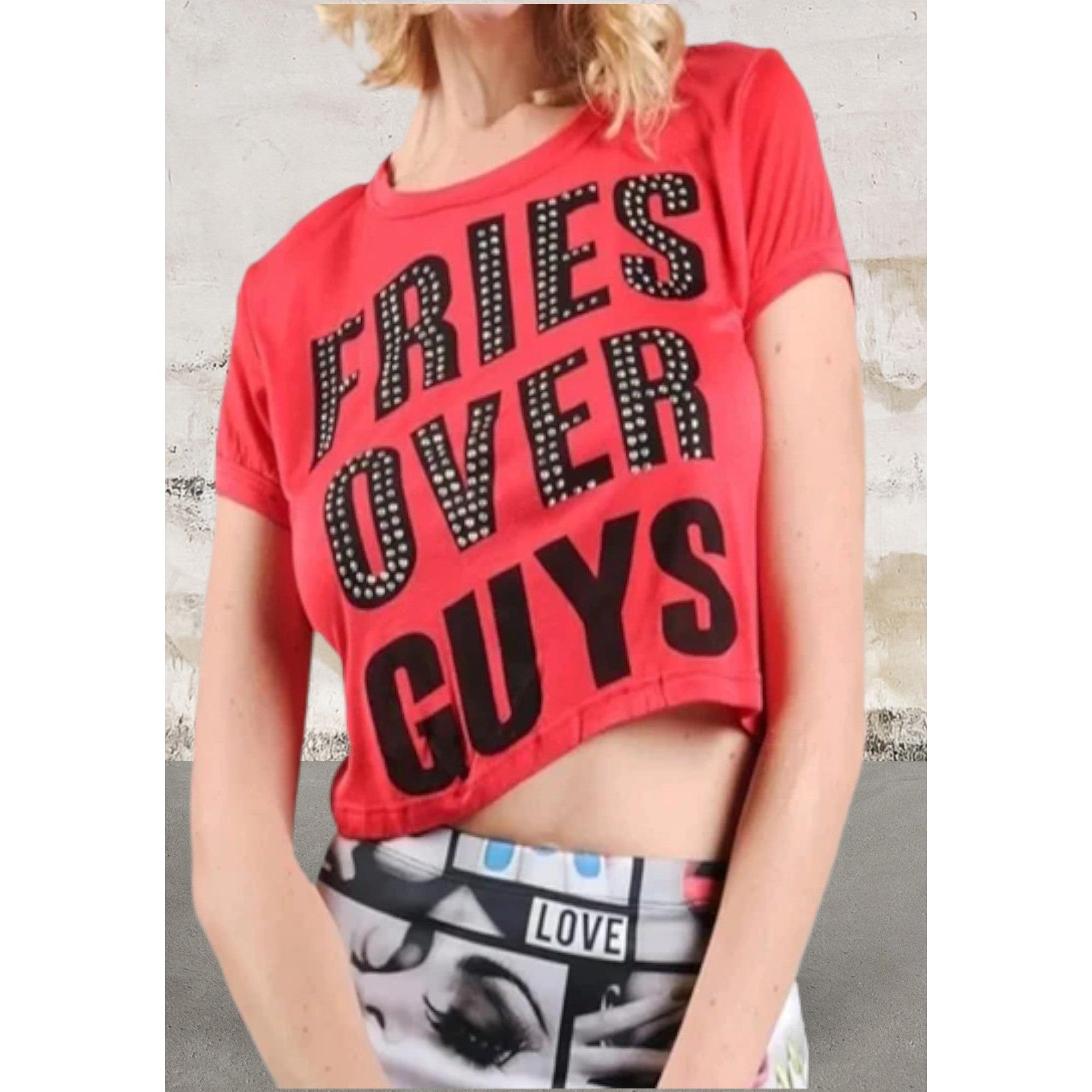 Juniors Fries Over Guys Graphic Studs Detail Crop Top