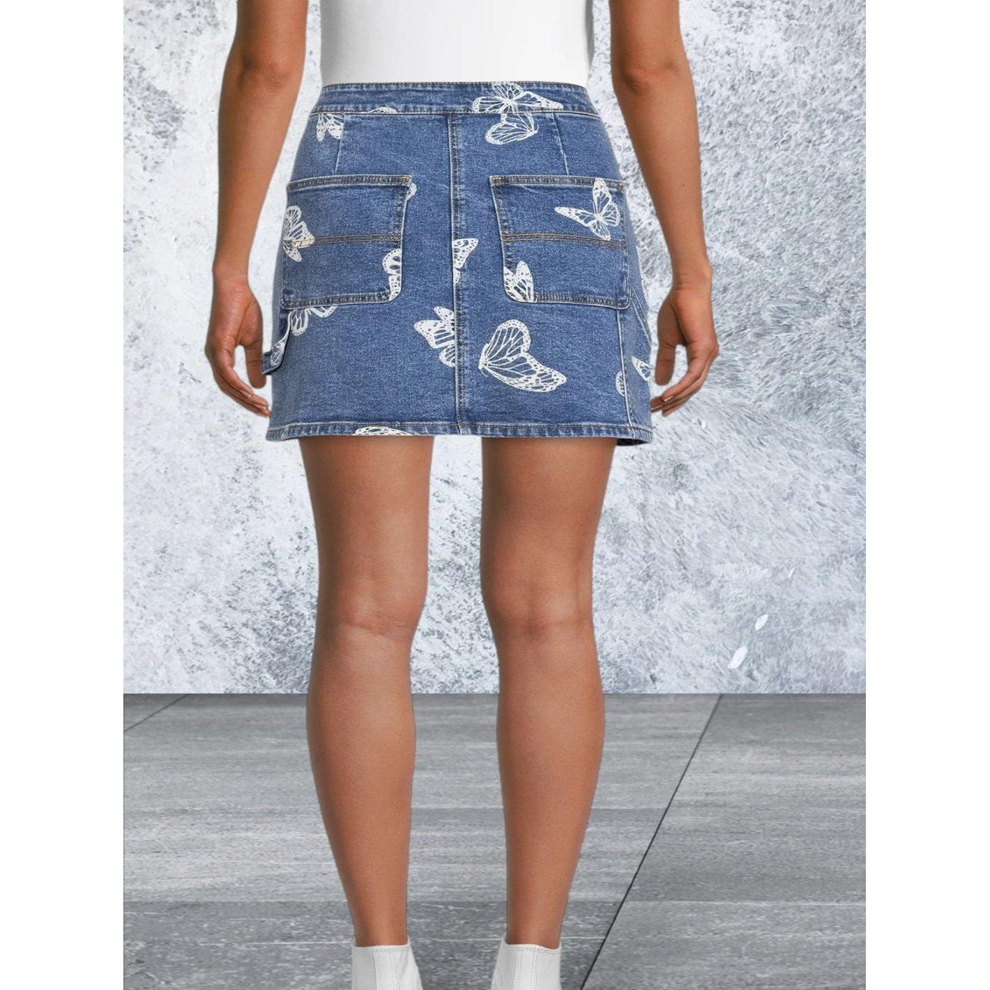 This denim skirt features a fun and playful butterfly graphic print, perfect for adding a touch of whimsy to any outfit. Made for juniors, this mini skirt is made of durable denim for long-lasting wear. Add a bit of personality to your wardrobe with this charming piece.