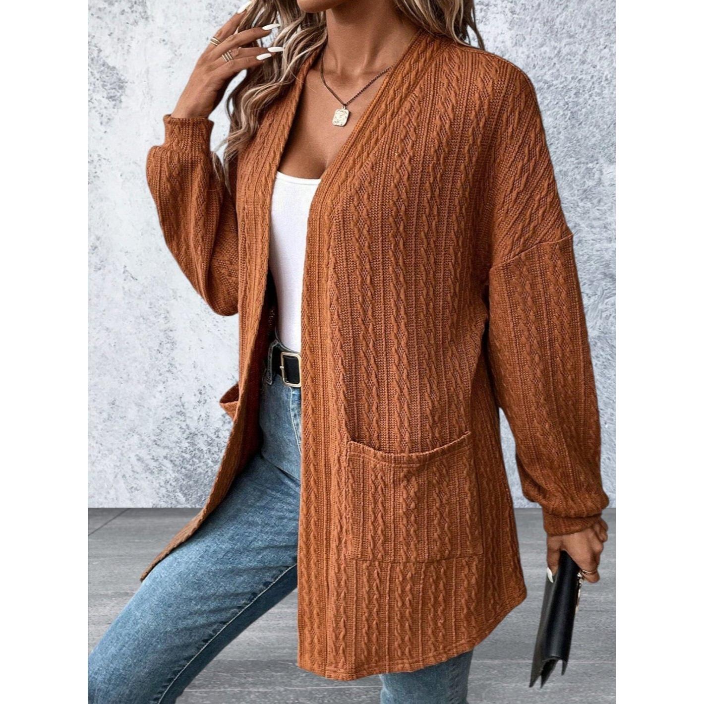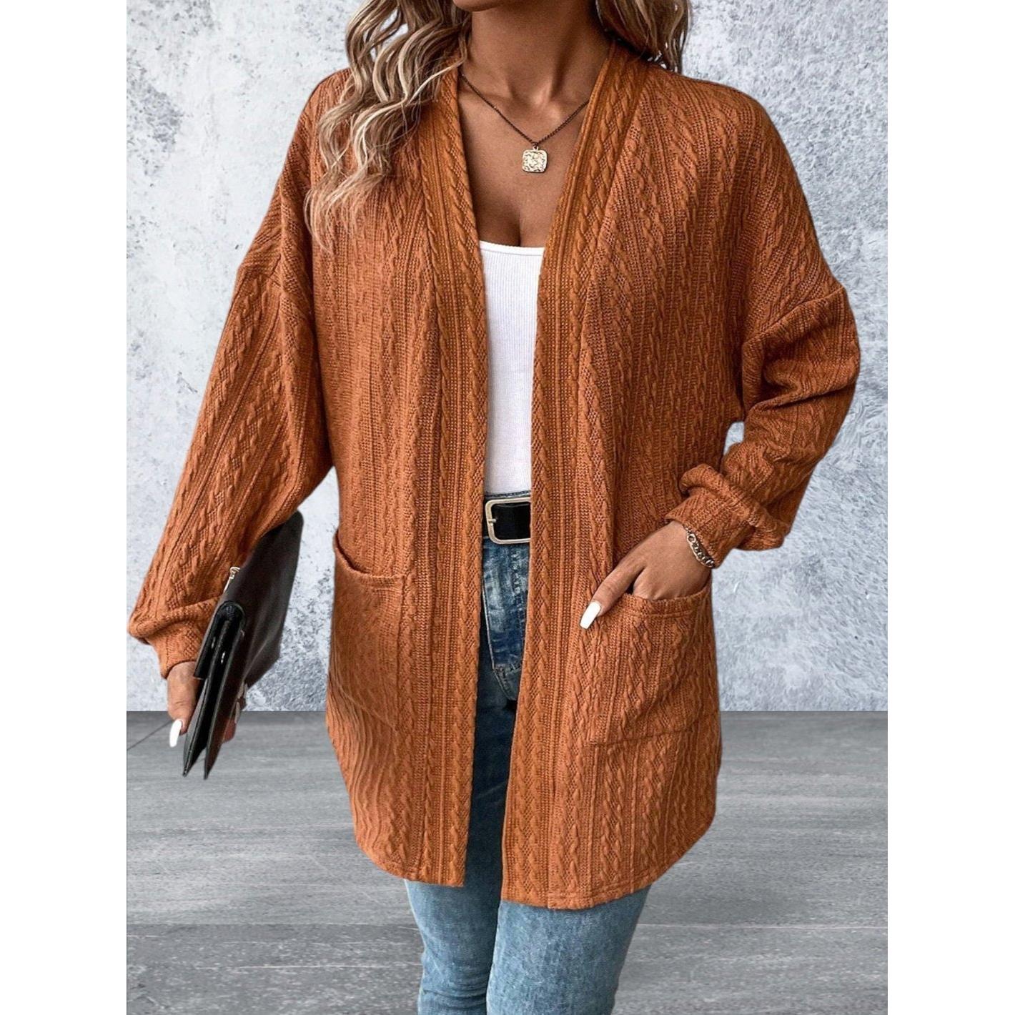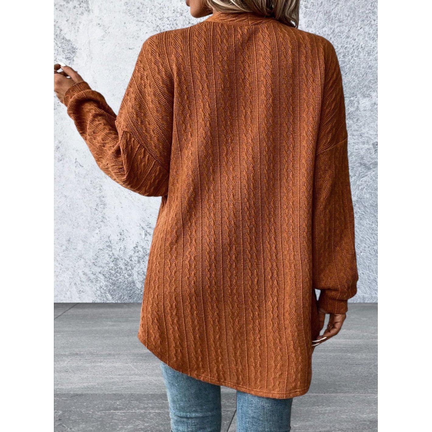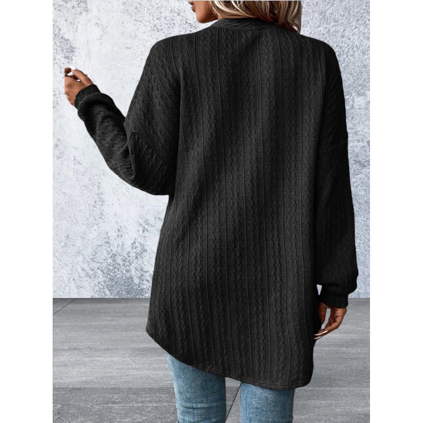 Expertly crafted with cozy black textured knit, this cardigan is both stylish and functional. With convenient side pockets and an open front design, it's perfect for layering and is sure to keep you warm and fashionable. Elevate your wardrobe with this must-have piece.
