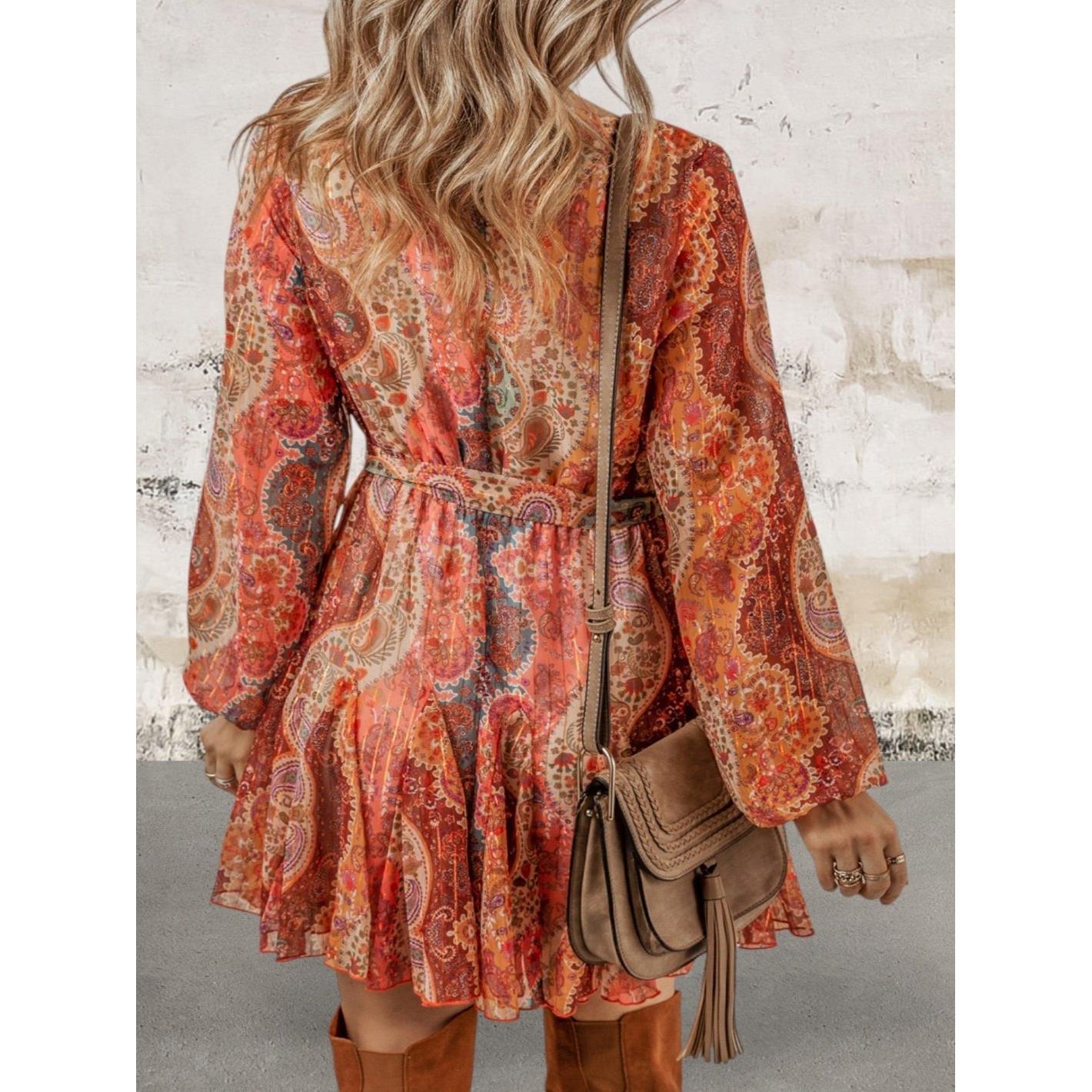 This chic boho-inspired dress features a vibrant orange paisley print and statement belted waist. The long sleeves and pleated texture add a touch of elegance, making it perfect for any occasion. Stay stylish and comfortable in this on-trend mini dress.
