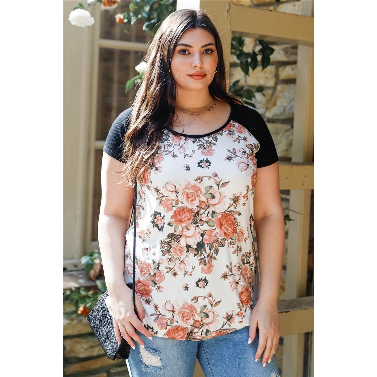 Plus size floral print and ribbed Black color block top round neckline, short sleeves, non-sheer, unlined, stretchy, casual, cute, floral look, girlish, spring/summer collection 32% Rayon 63% Polyester 4% Spandex Cream FloralSKU: RB56126
