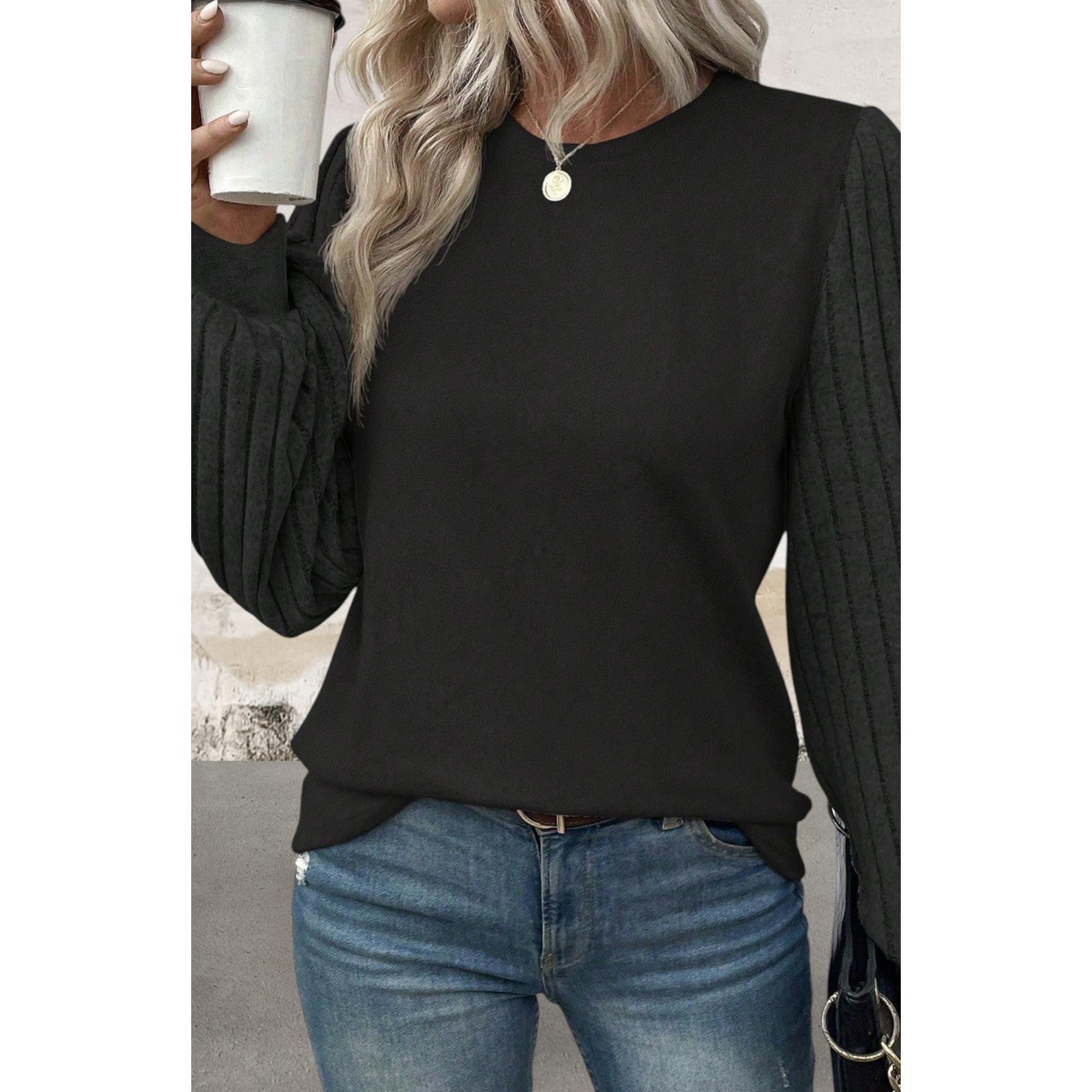 Crafted from soft, lightweight fabric, this Black Contrast Ribbed Bishop Sleeve Top offers a fashionable twist on the classic black blouse. Featuring contrasting ribbed details and elegant bishop sleeves, this top is perfect for both casual and formal occasions. With its versatile design, you can effortlessly transition from day to night in style.
