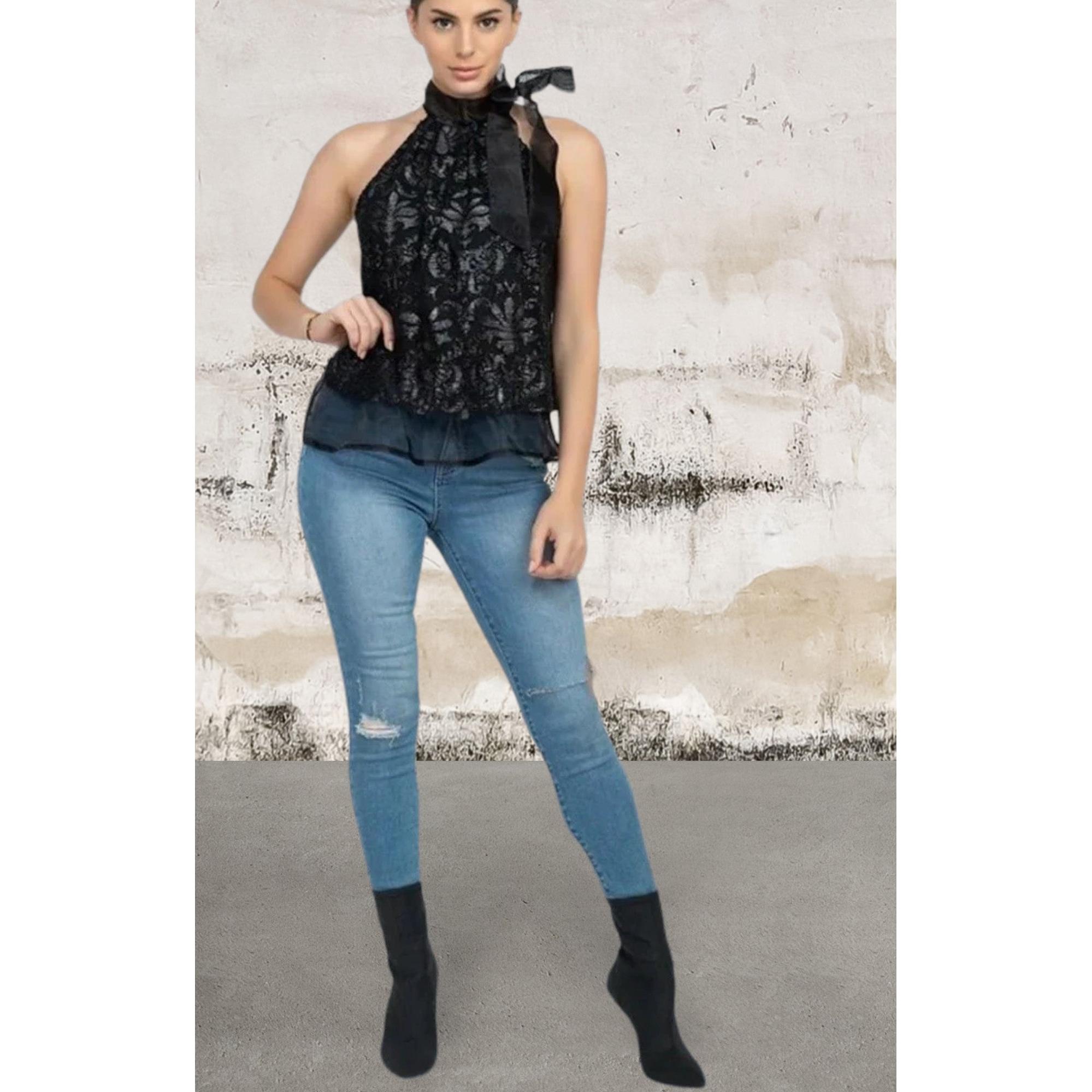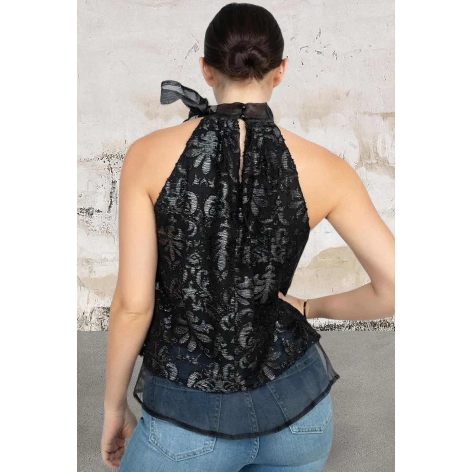 Sleeveless top featuring top featuring semi sheer material, a print, mock neckline with a neck tie, and a back keyhole closure.