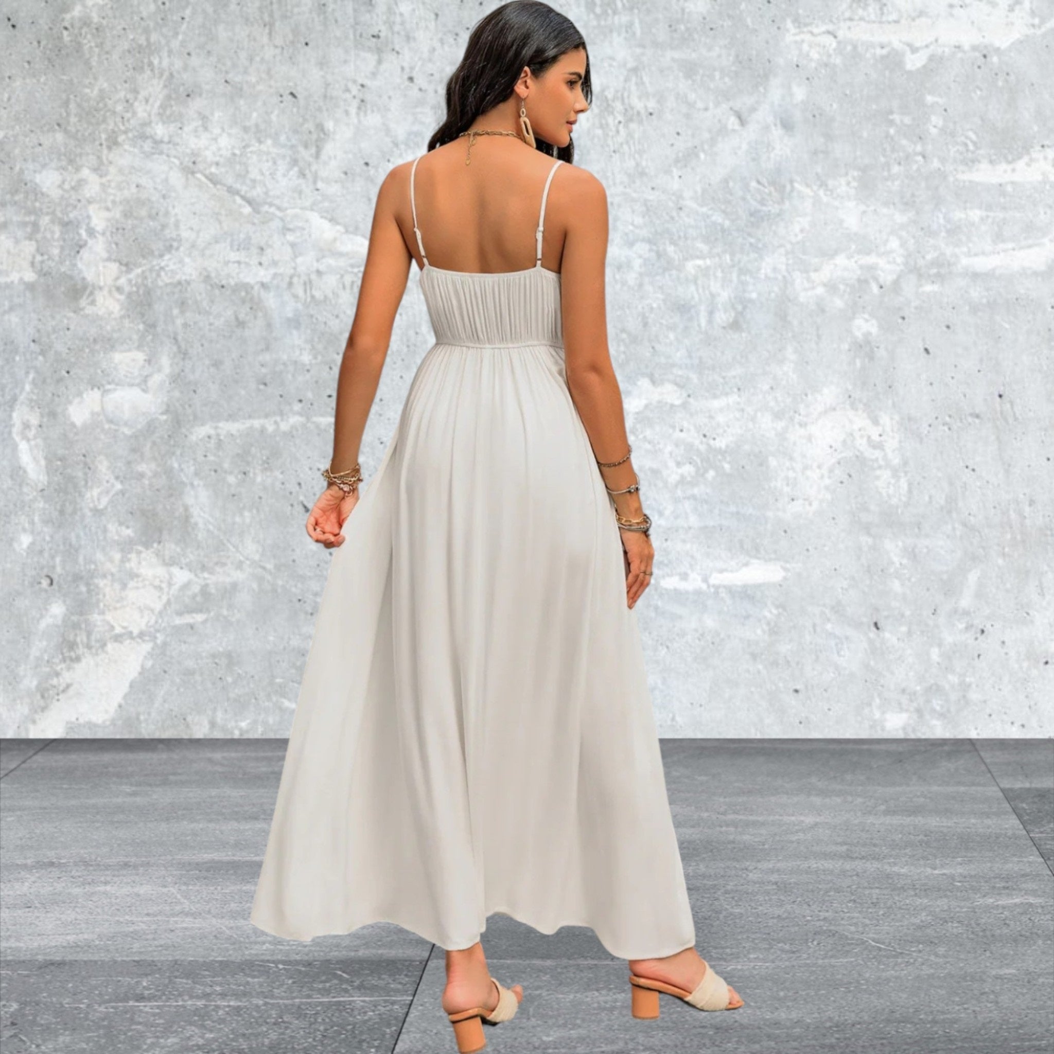 This Sleeveless V-Neck Square Neck Maxi Cami Dress is a versatile and stylish addition to any wardrobe. With its flattering neckline and flowing silhouette, it can easily go from day to night. Made from high-quality materials, it combines comfort and fashion for a perfect fit.