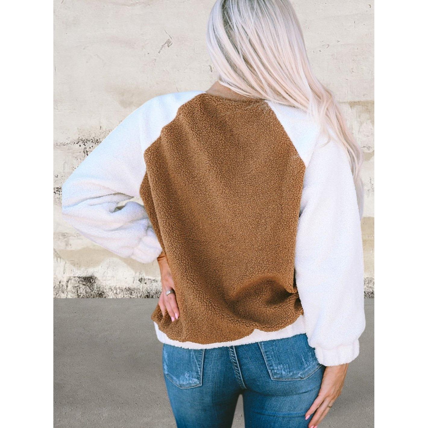 Stay warm and stylish this winter with our Brown Contrast White Sleeve Snap Button Sherpa Jacket. The contrast of brown and white is not only eye-catching, but the snap button closure and sherpa lining provide ultimate comfort and insulation against the cold. Expertly crafted, this jacket is a must-have for any fashion-forward individual.