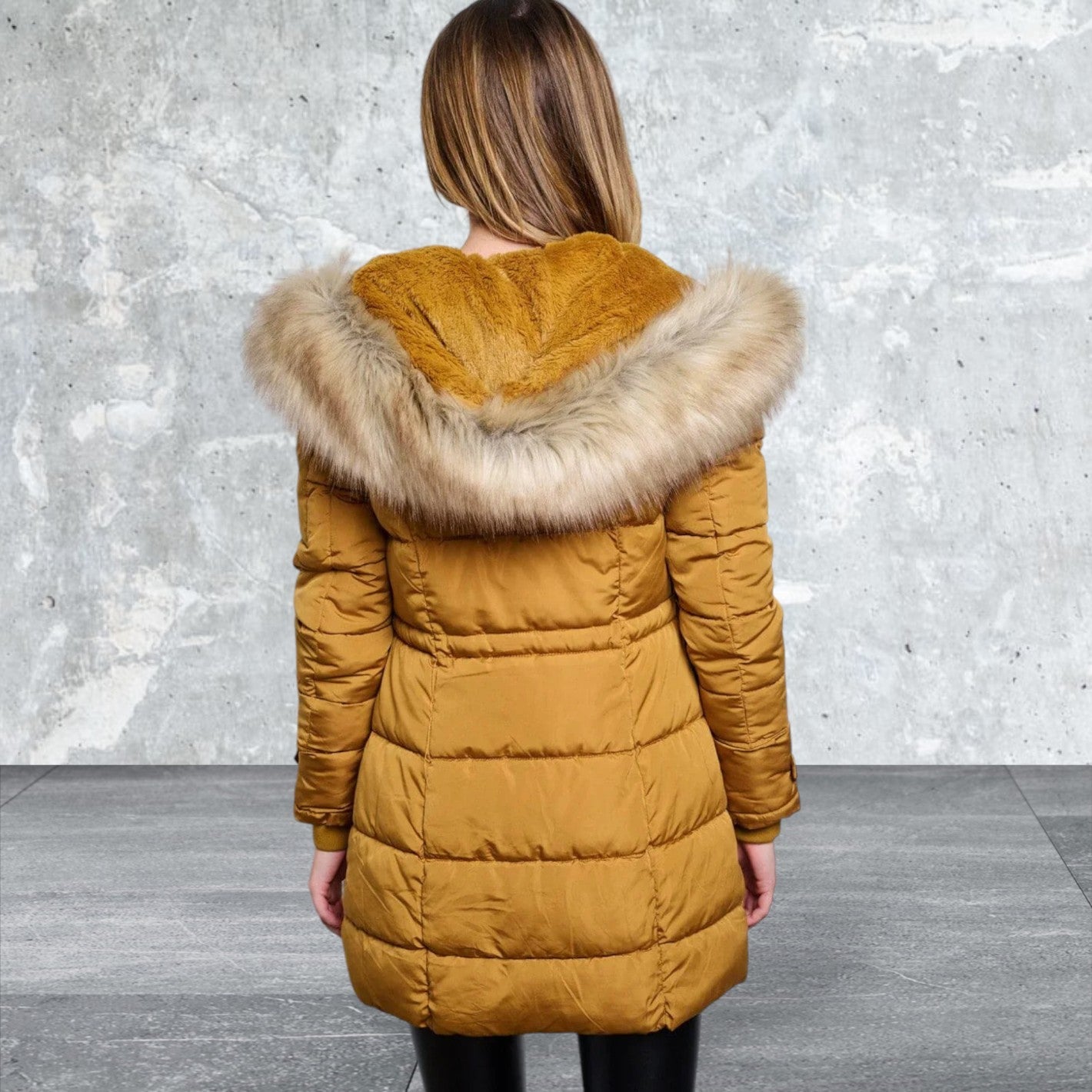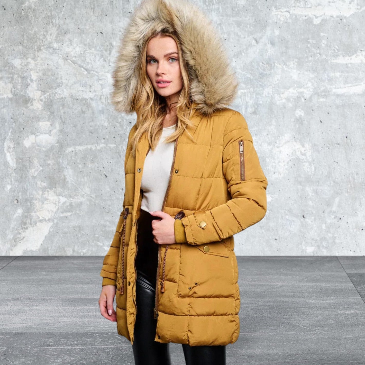 This women's long sleeve zip up puffer coat features a removable hood for customizable wear. Keep warm and stylish in this versatile and functional winter essential.