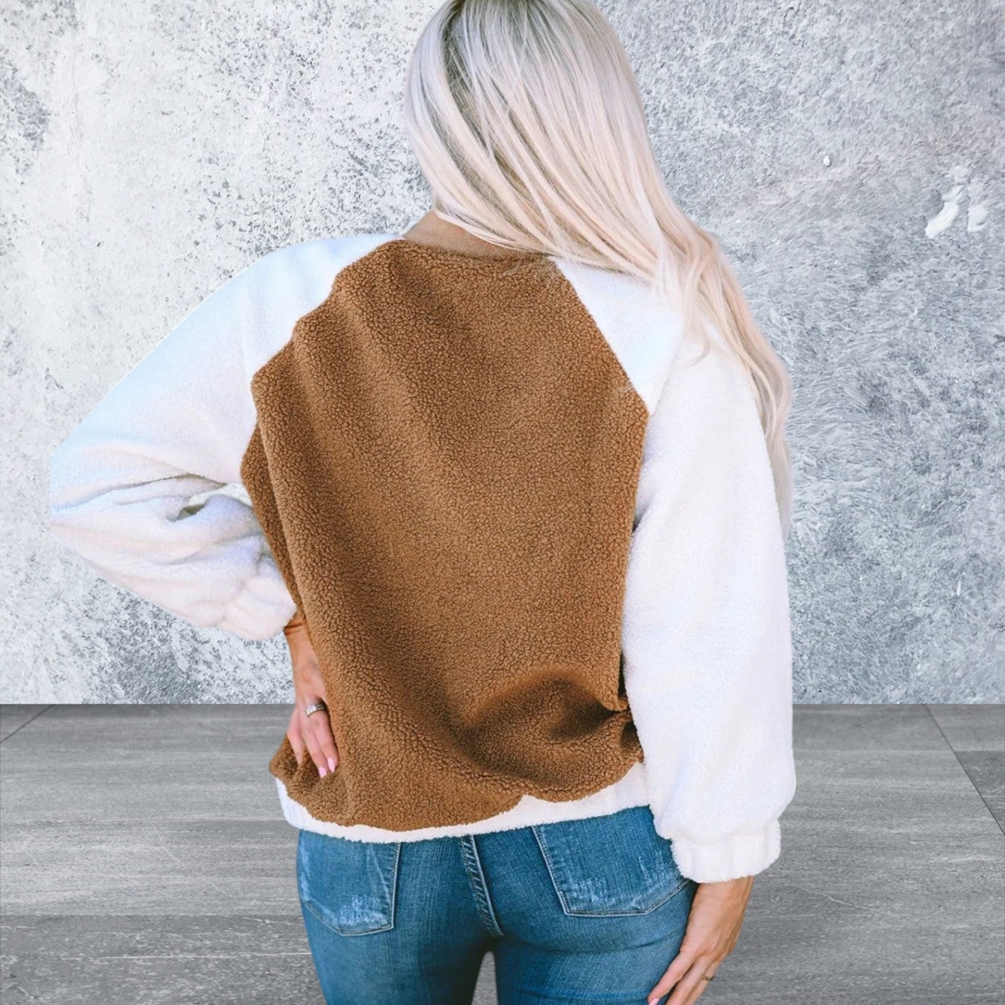 This jacket features a striking contrast between the brown exterior and white sleeves, making it a stylish addition to any wardrobe. The snap button closure ensures a secure fit, while the sherpa material provides warmth and comfort. Dress up any outfit with this versatile and fashionable jacket.
