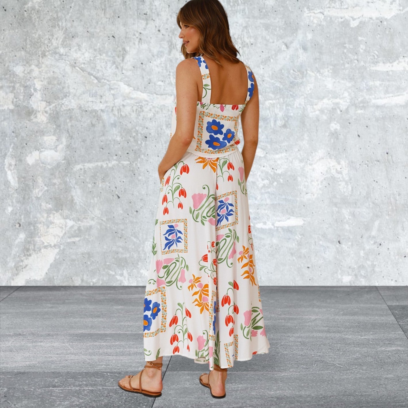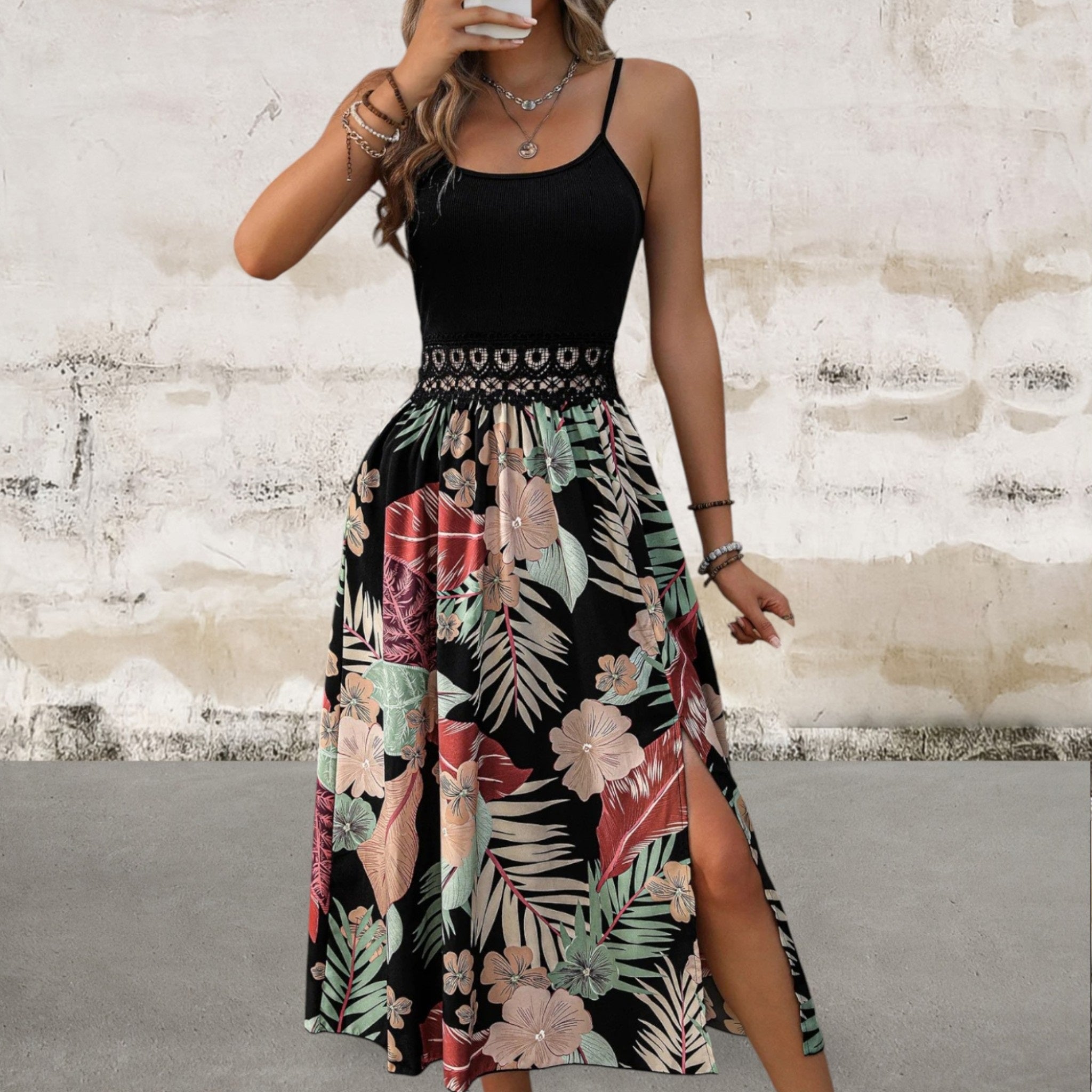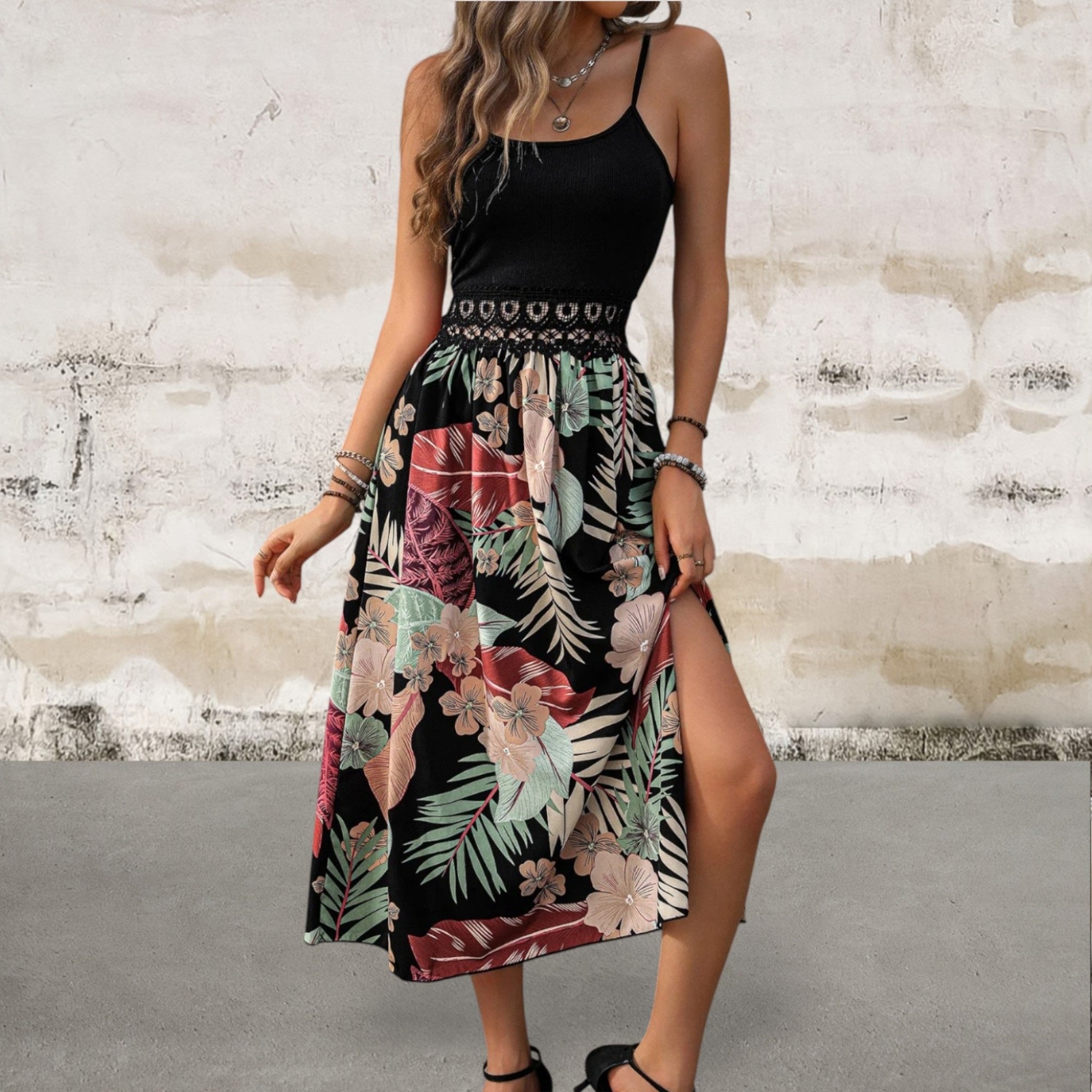 Sleeveless Lace Detail Floral Slit Midi Cami Dress