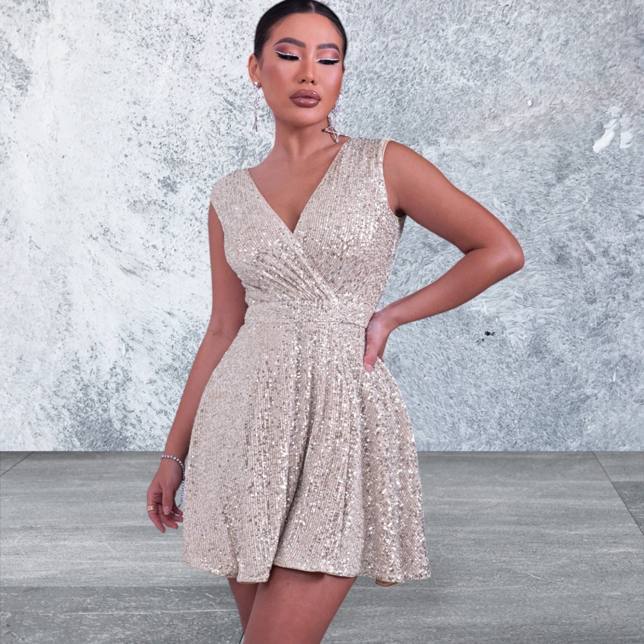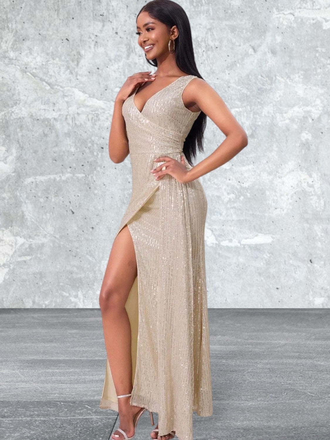 Sequin V-Neck Lantern Sleeve Maxi Dress