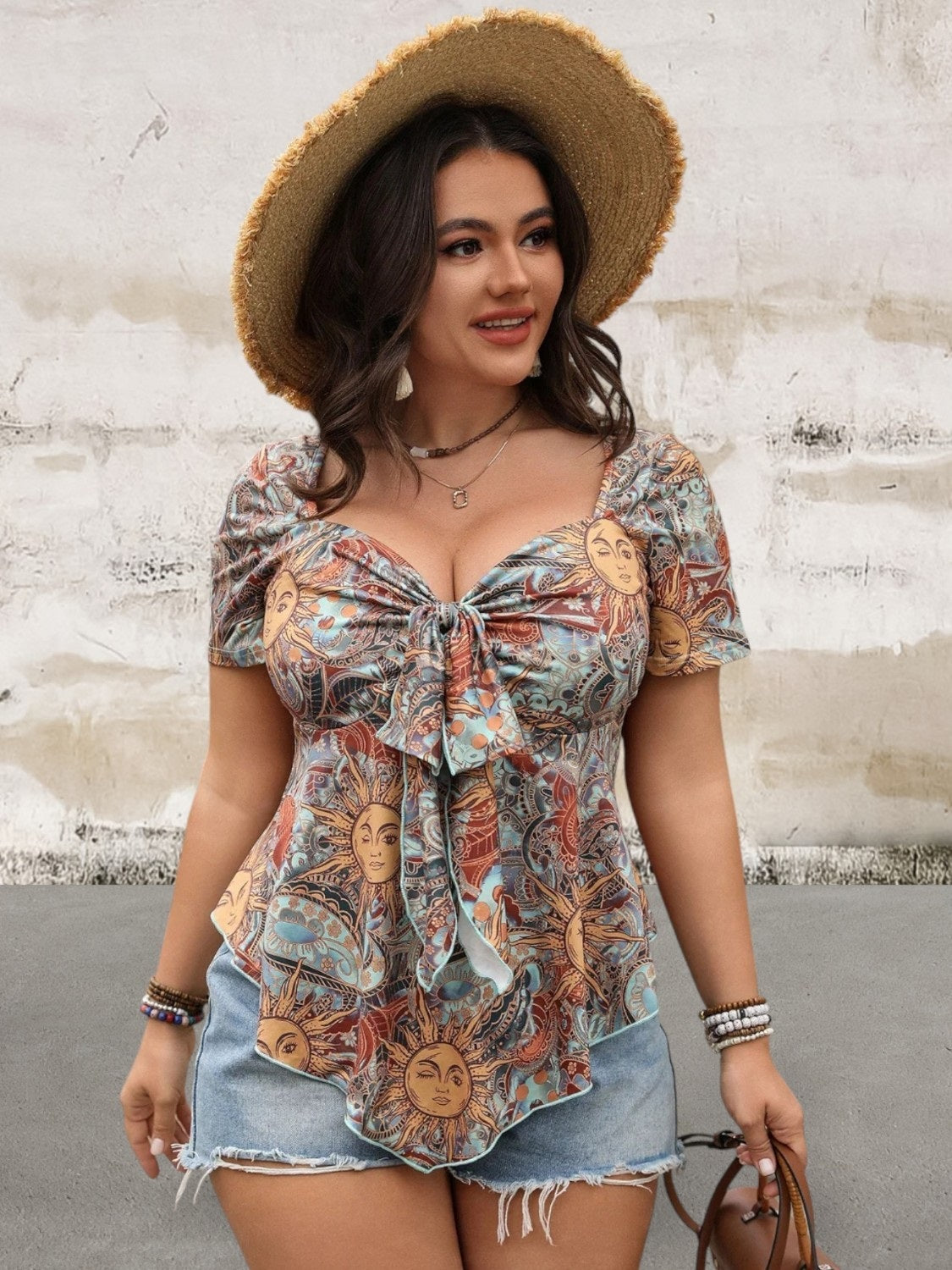 Plus Size Short Sleeve Printed Sweetheart Neck Top