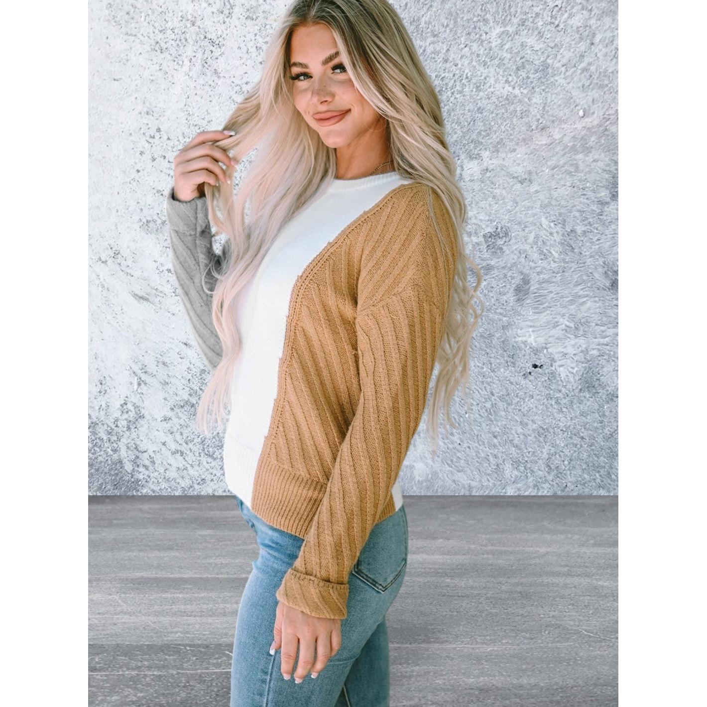 Round Neck Trendy Color Block Drop Shoulder Knit Sweater