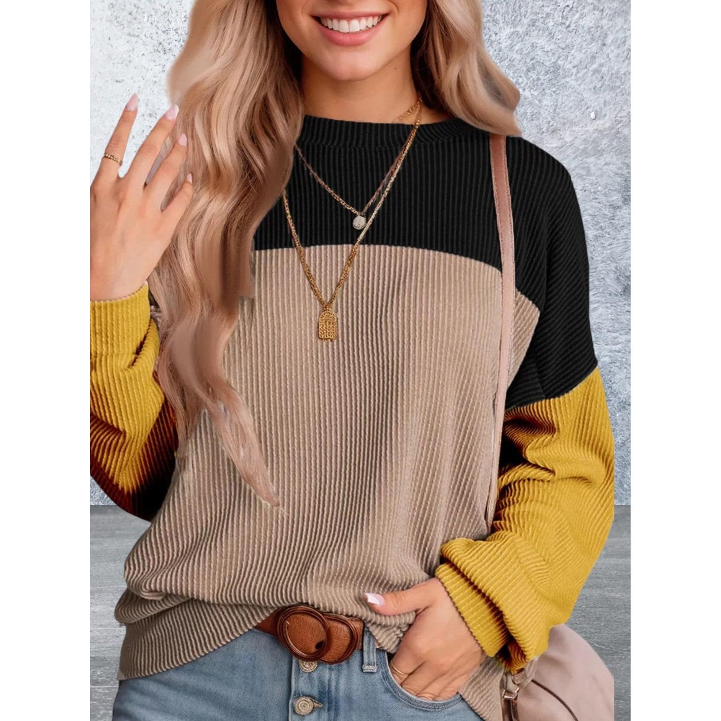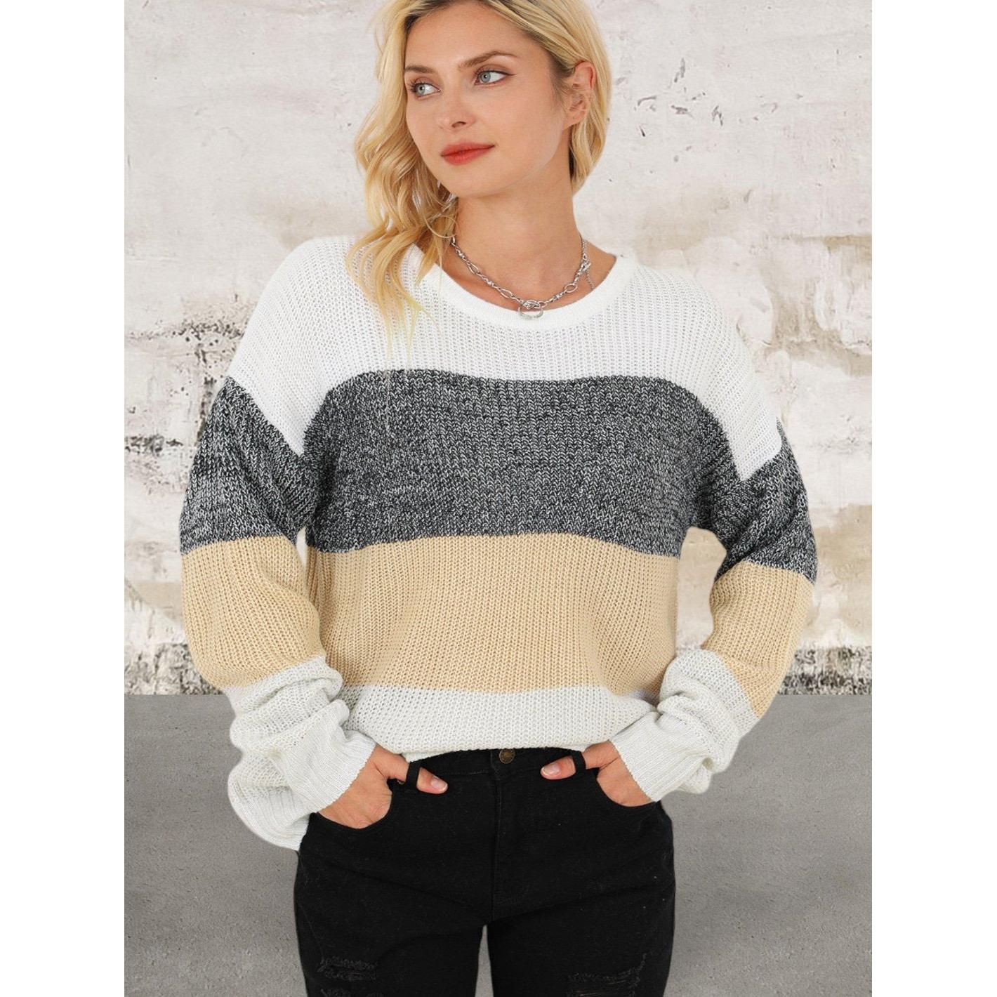 Long Sleeve Round Neck Colorblock Pullover Sweater