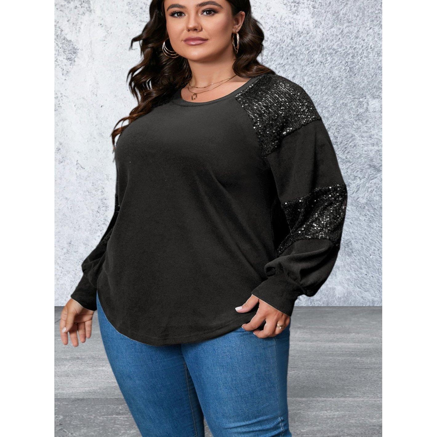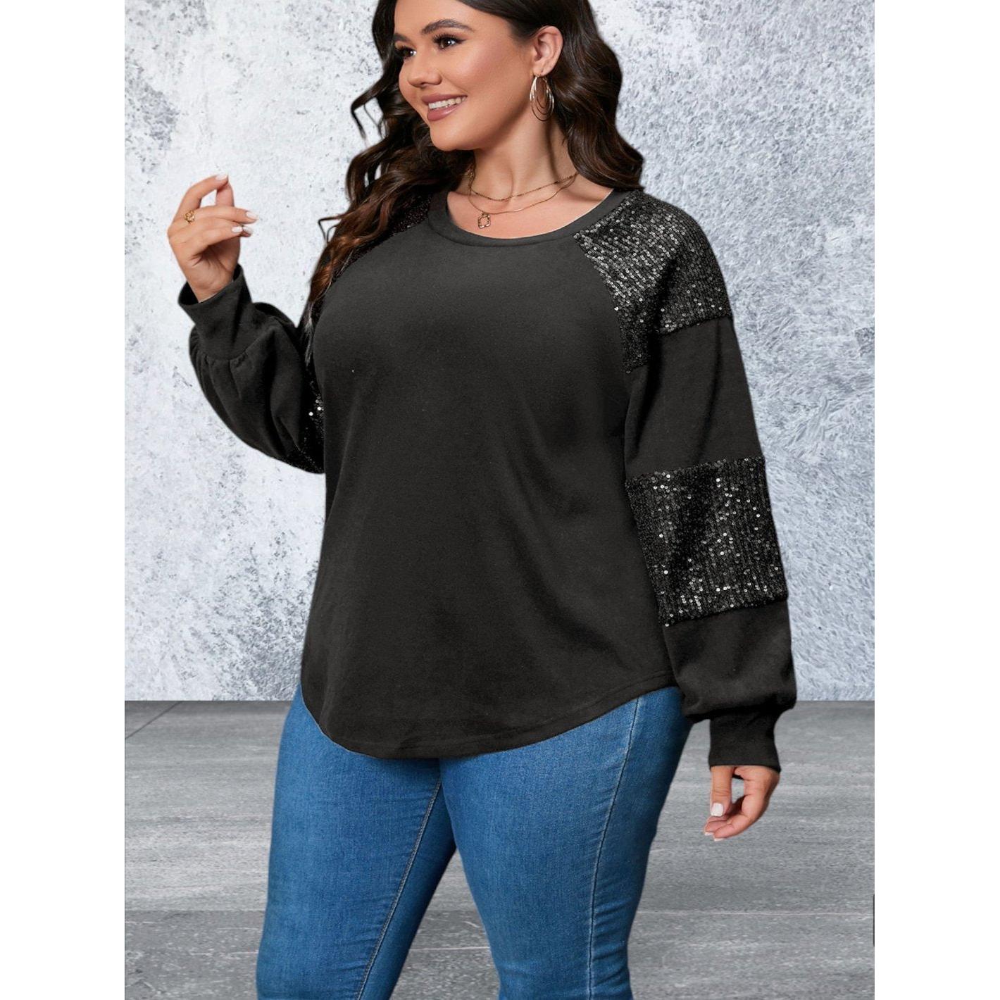Plus Size Sequin Crew Neck Long Sleeve Top