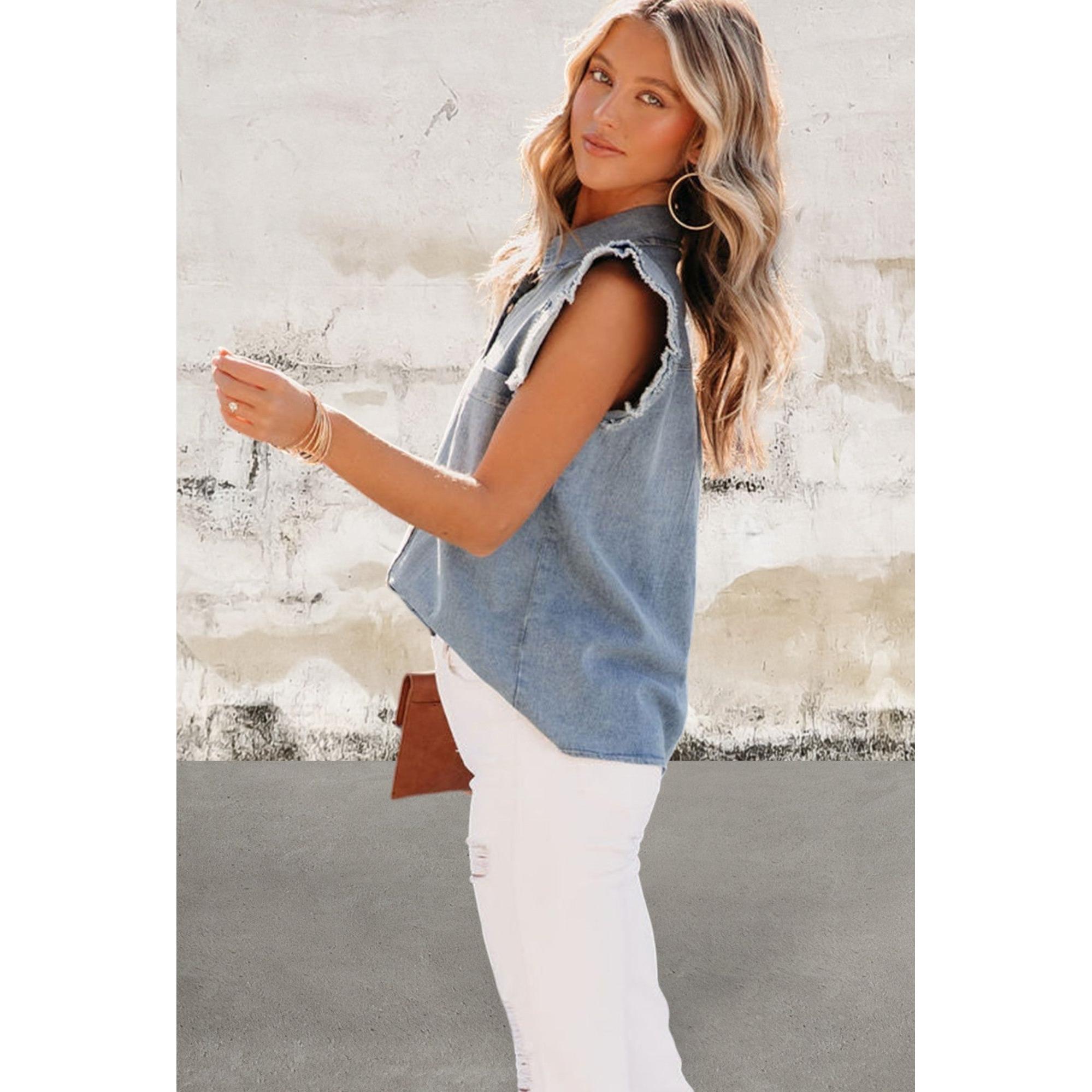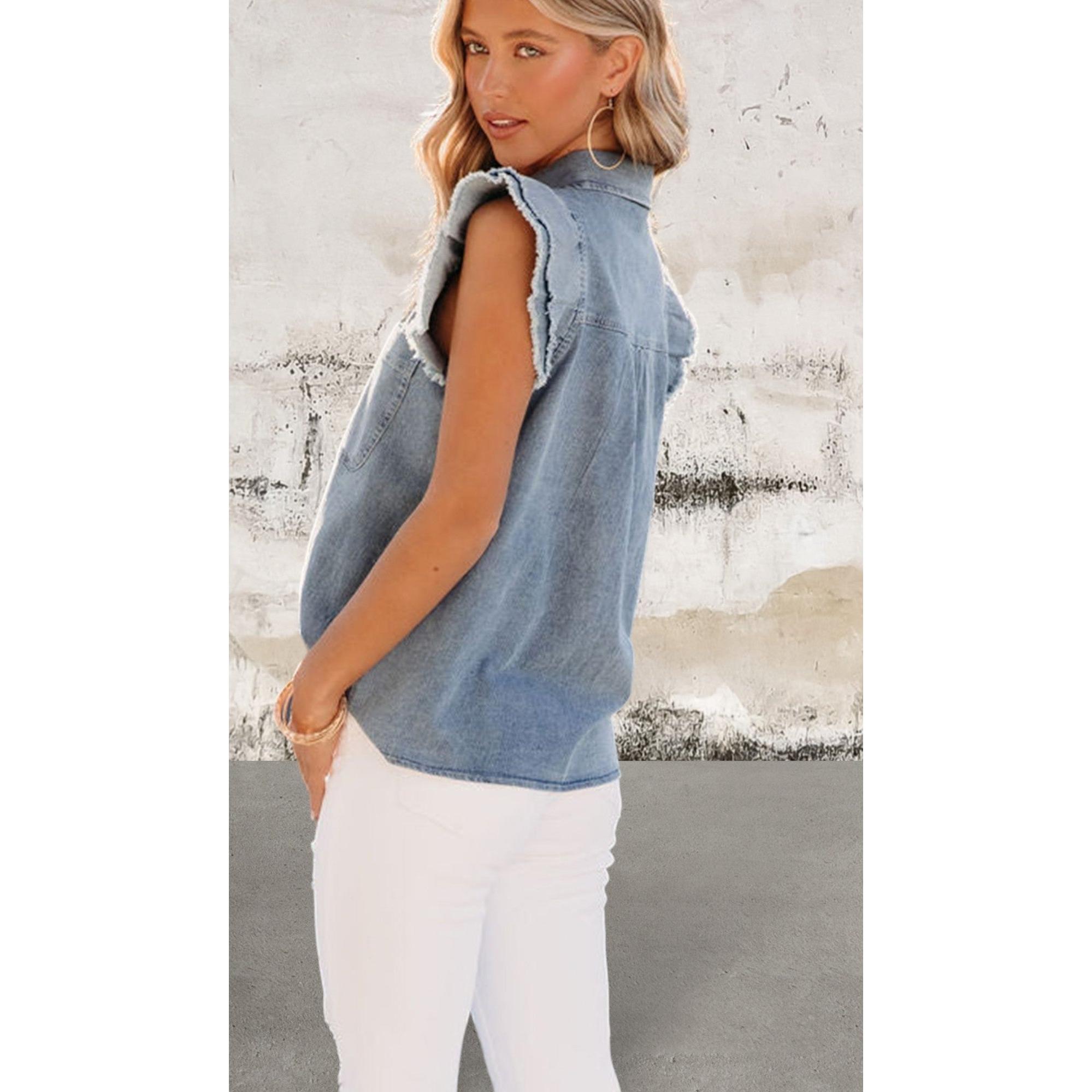 Elevate your denim game with our Beau Blue Frayed Ruffle Sleeve Denim Shirt. Featuring unique frayed ruffle sleeves, this shirt effortlessly adds a touch of femininity to any outfit. Crafted with high-quality denim fabric, this shirt offers both style and comfort. Perfect for any fashion-forward individual.