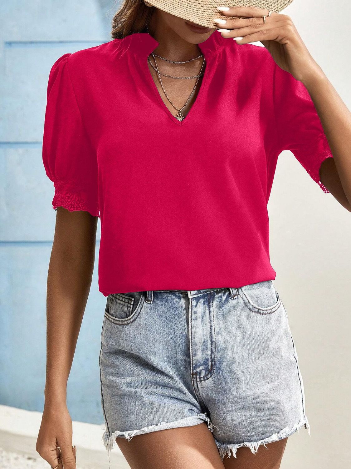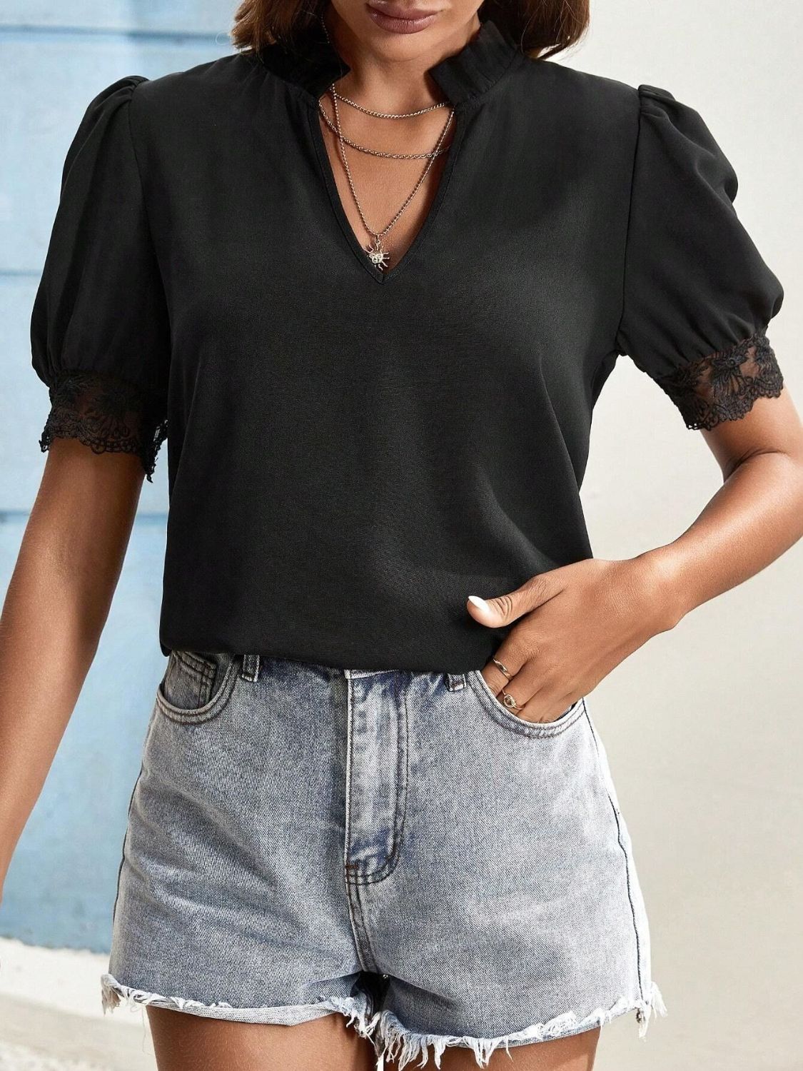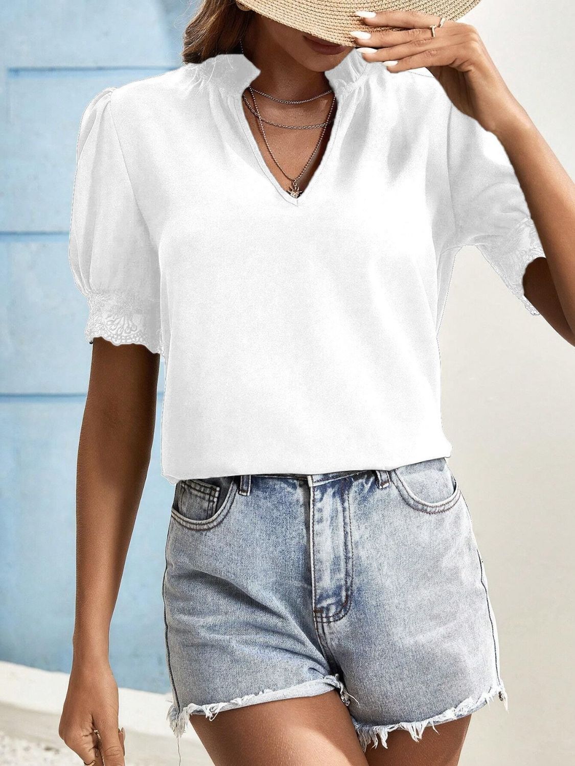 Short Sleeve Lace Detail Notched Top