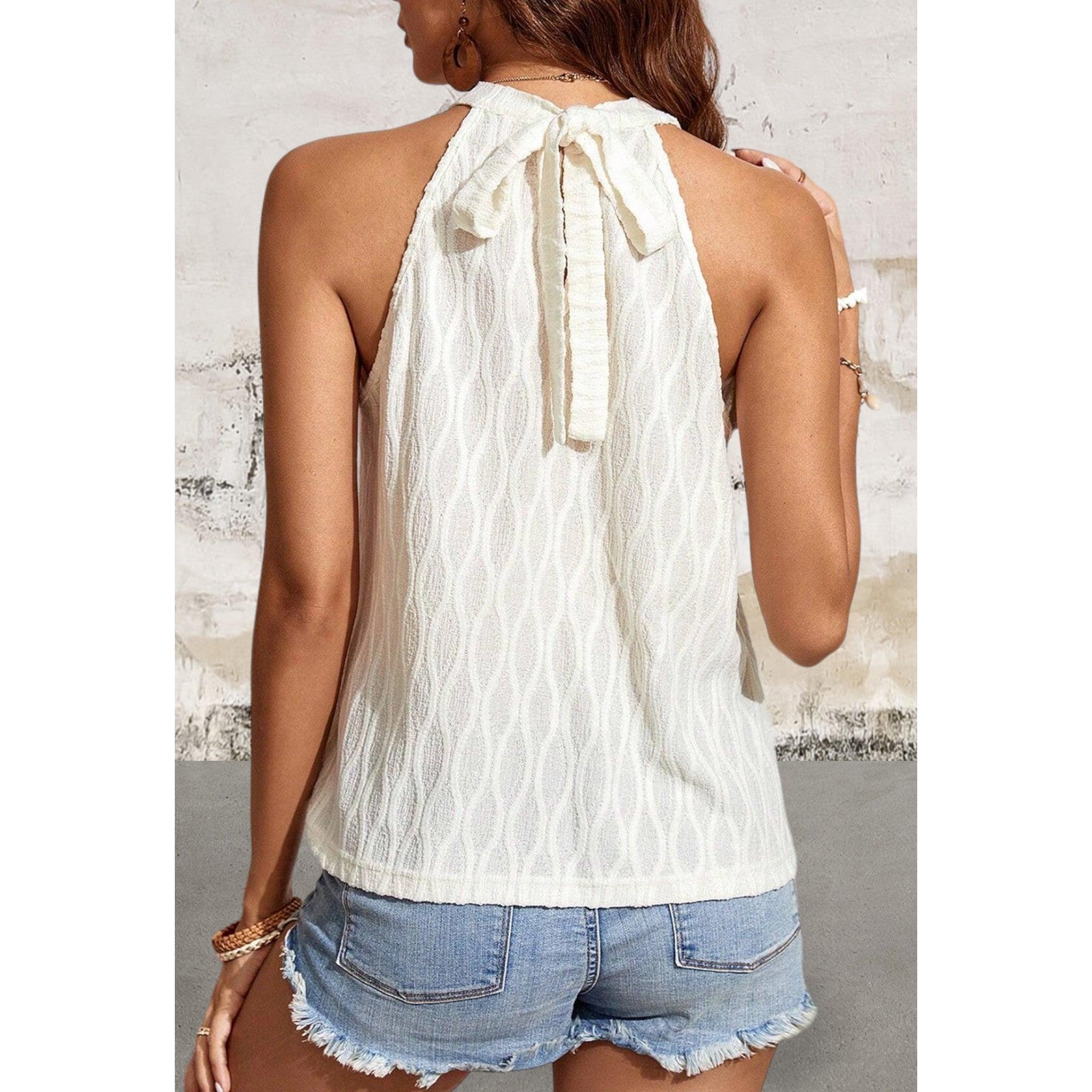 This Sleeveless Frenchy Lace Halter Top features a beige textured design with delicate Frenchy lace trim, creating a chic and sophisticated look. Made from high-quality material, it offers comfort and style. Perfect for any occasion, this halter tank top is a must-have for any fashion forward individual.