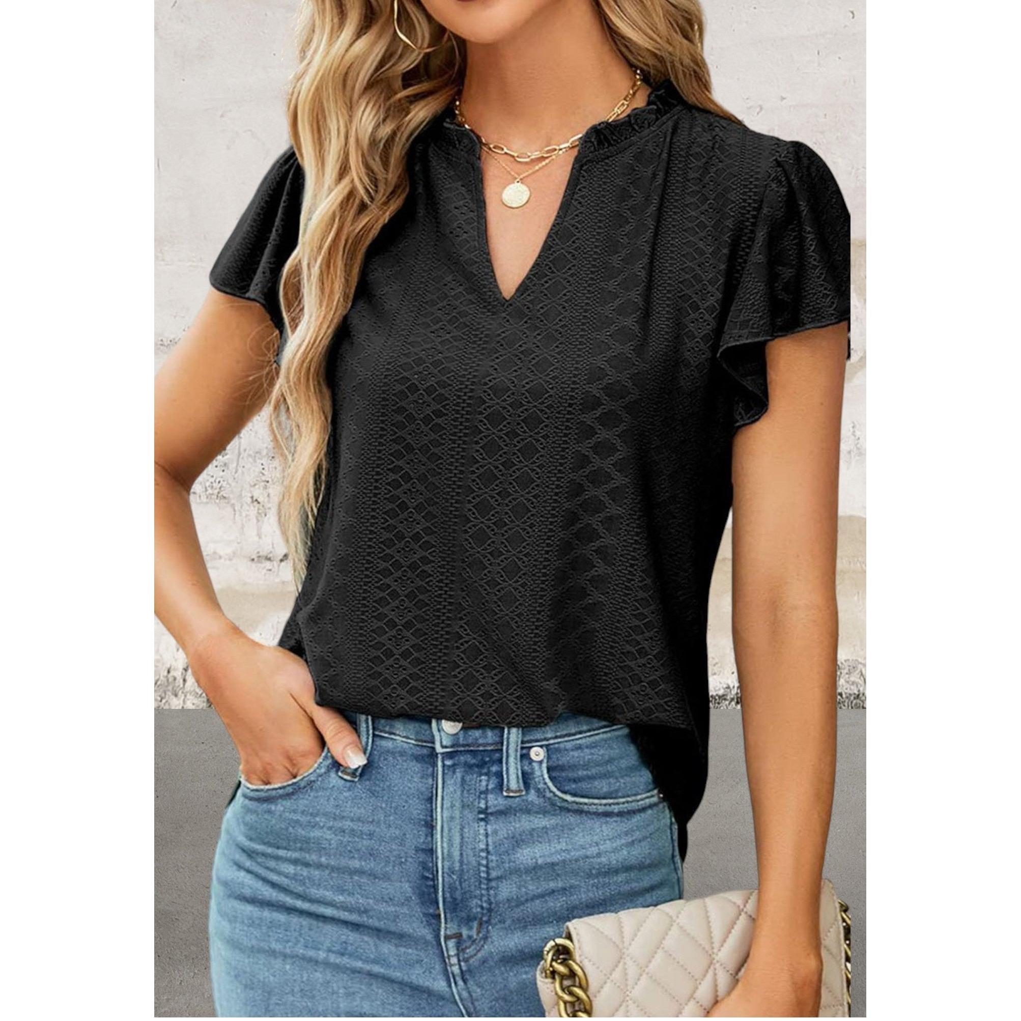 Blue Frayed Ruffle Short Sleeve Denim Shirt