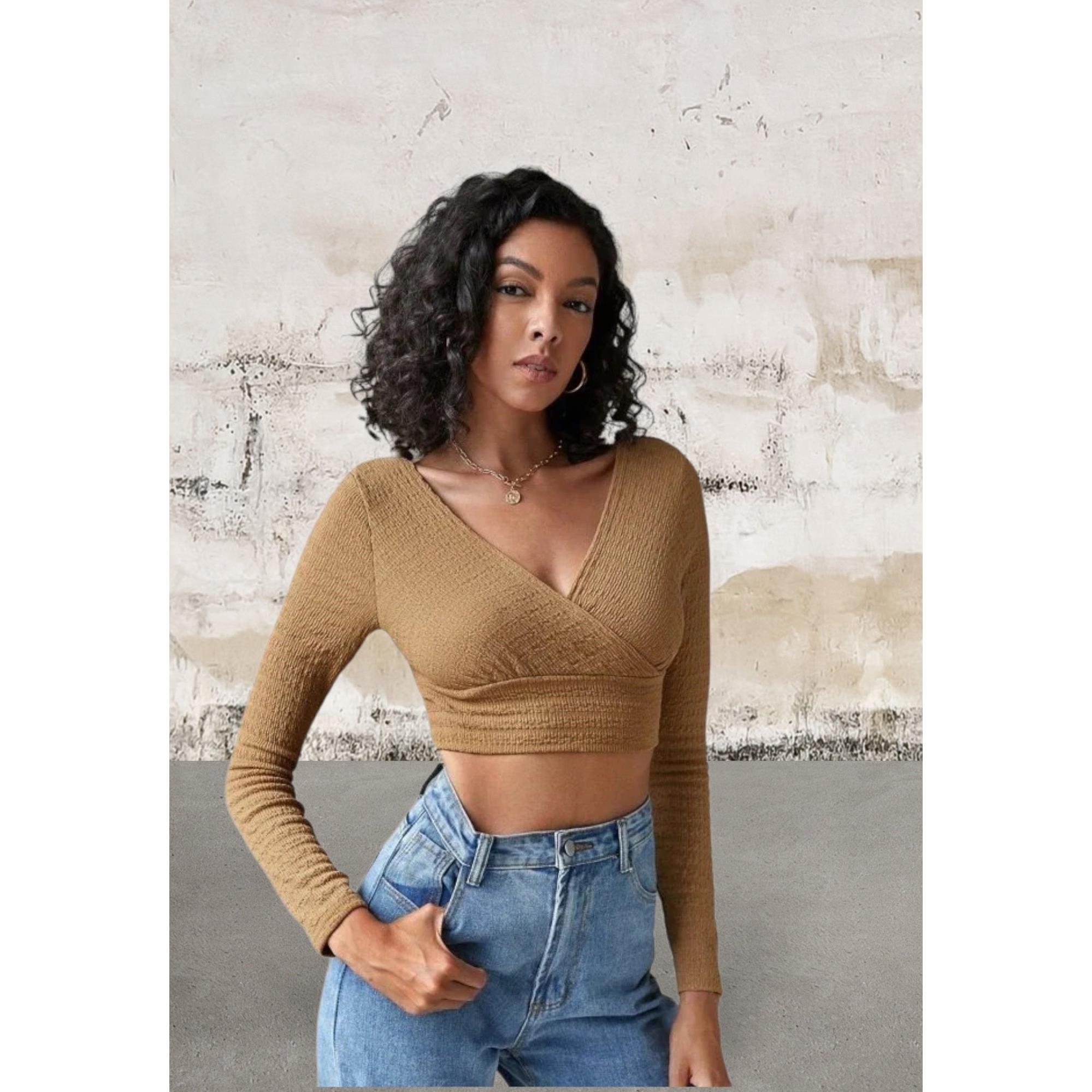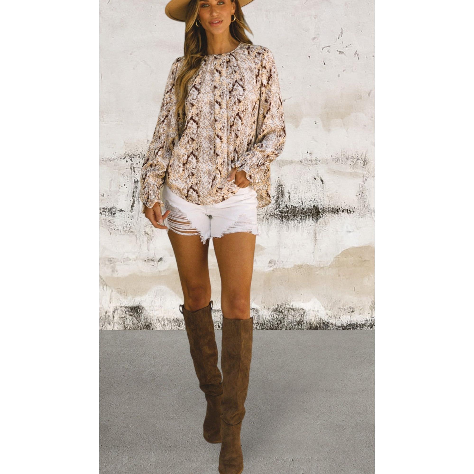 Long Sleeve Brown Glitter Snake Pleated Round Neck Blouse